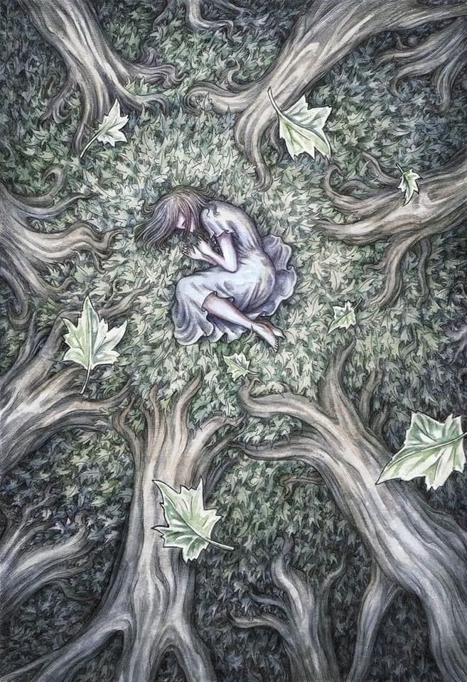 Тени за деревьями на иллюстрации символизируют как реальные опасности (дикие животные, природные препятствия), так и внутренние страхи Триши.